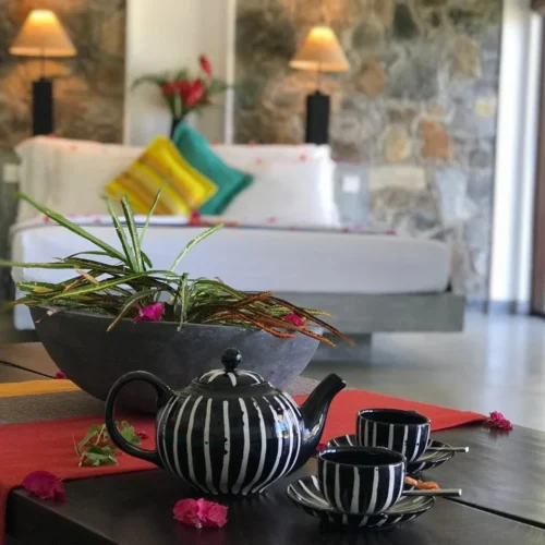 Extra-large Lagoon view bedrooms (74 sqm): Four extra-large Lagoon view rooms are located on the ground floor and opens out to private balconies. Up to two additional beds can be included for 4 adults or a family of 2 adults and 2 children.
